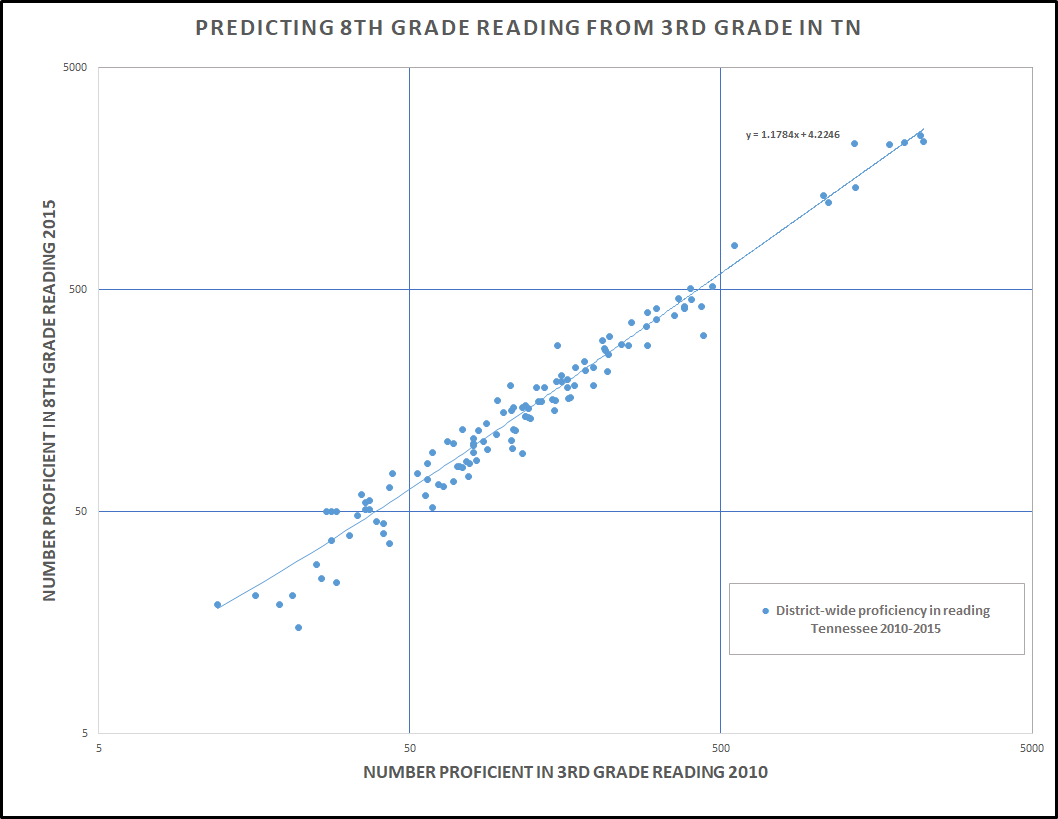 The above chart school district reading scores illustrates the relationship between third and eighth-grade scores in Tennessee. Each dot represents a school district at third grade and five years later at grade eight. As you can see, for the average school district, the number of students who were proficient readers in the third grade is about the same as the number who were proficient in the eighth grade five years later. Some students may have improved and others may have regressed, but the total number stayed about the same.
